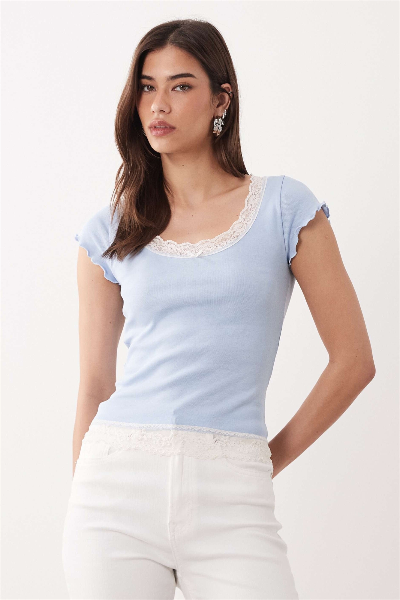 Приталенный топ с круглым вырезом из ребристой ткани с кружевной отделкой