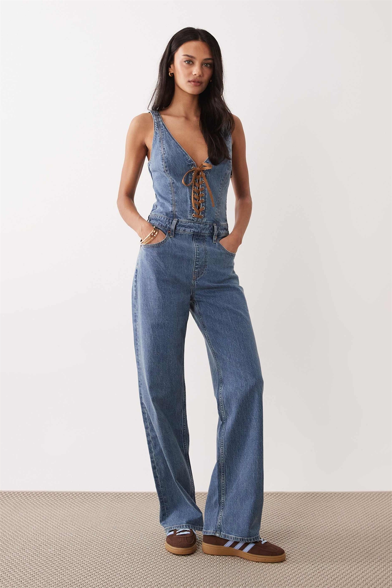 Комбинезон из джинсовой ткани с расклешенными штанинами и шнуровкой спереди
