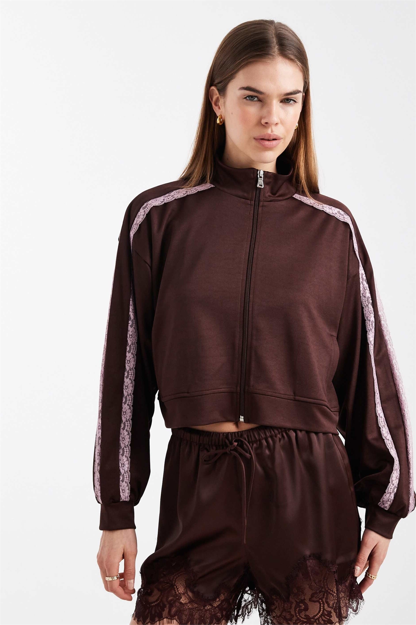Спортивная куртка из трикотажа с воротником-воронкой и кружевной отделкой