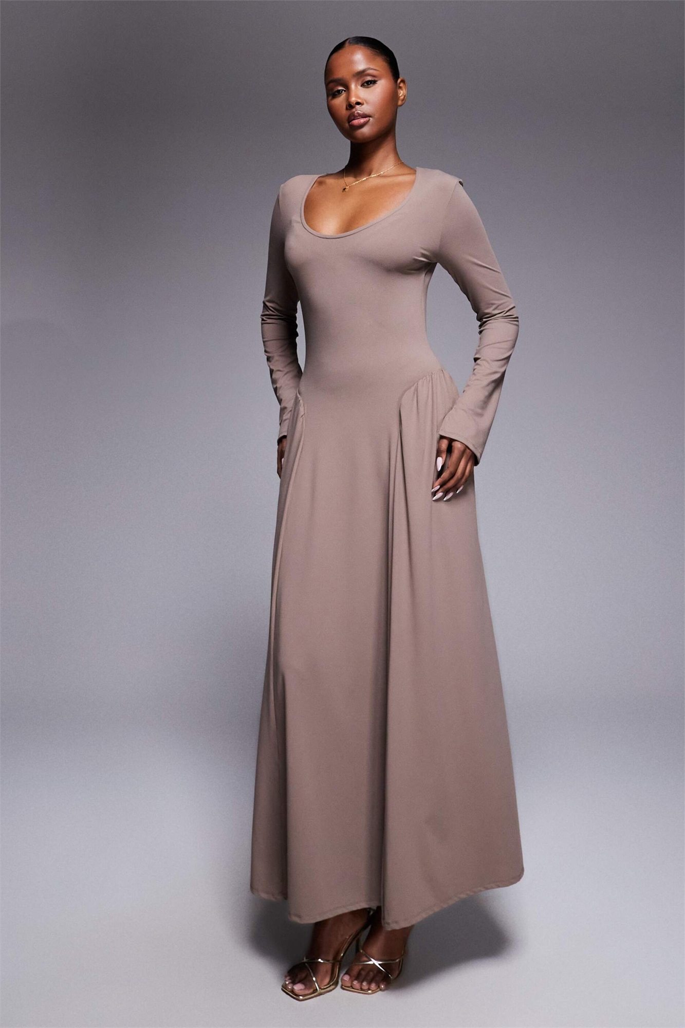 Платье средней длины с круглым вырезом, длинными рукавами и заниженной талией