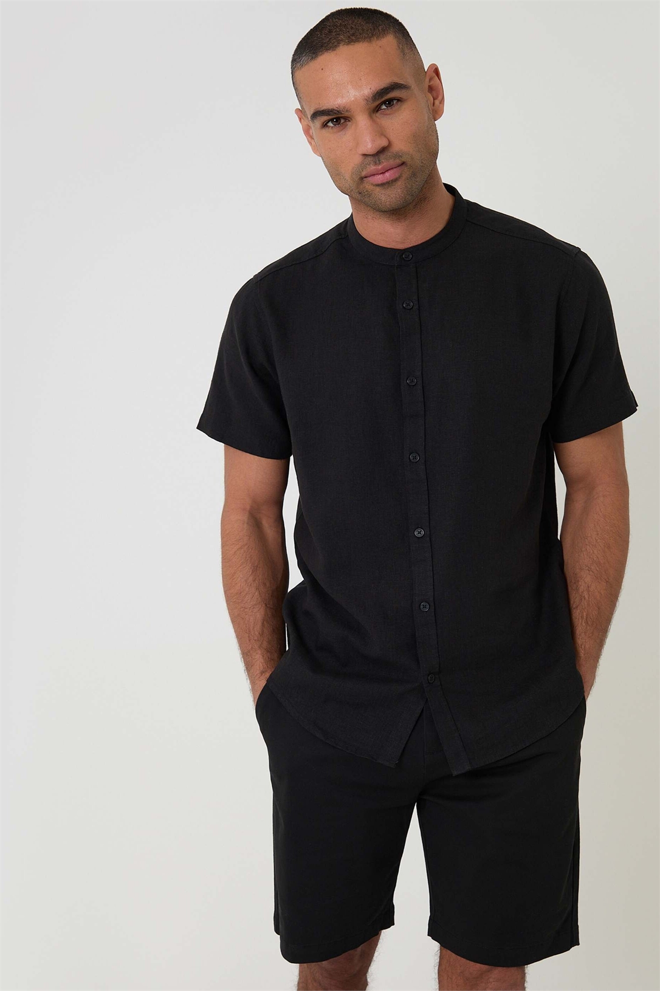 Рубашка с коротким рукавом из смесовой ткани с льняным эффектом и воротником «под дедушку»