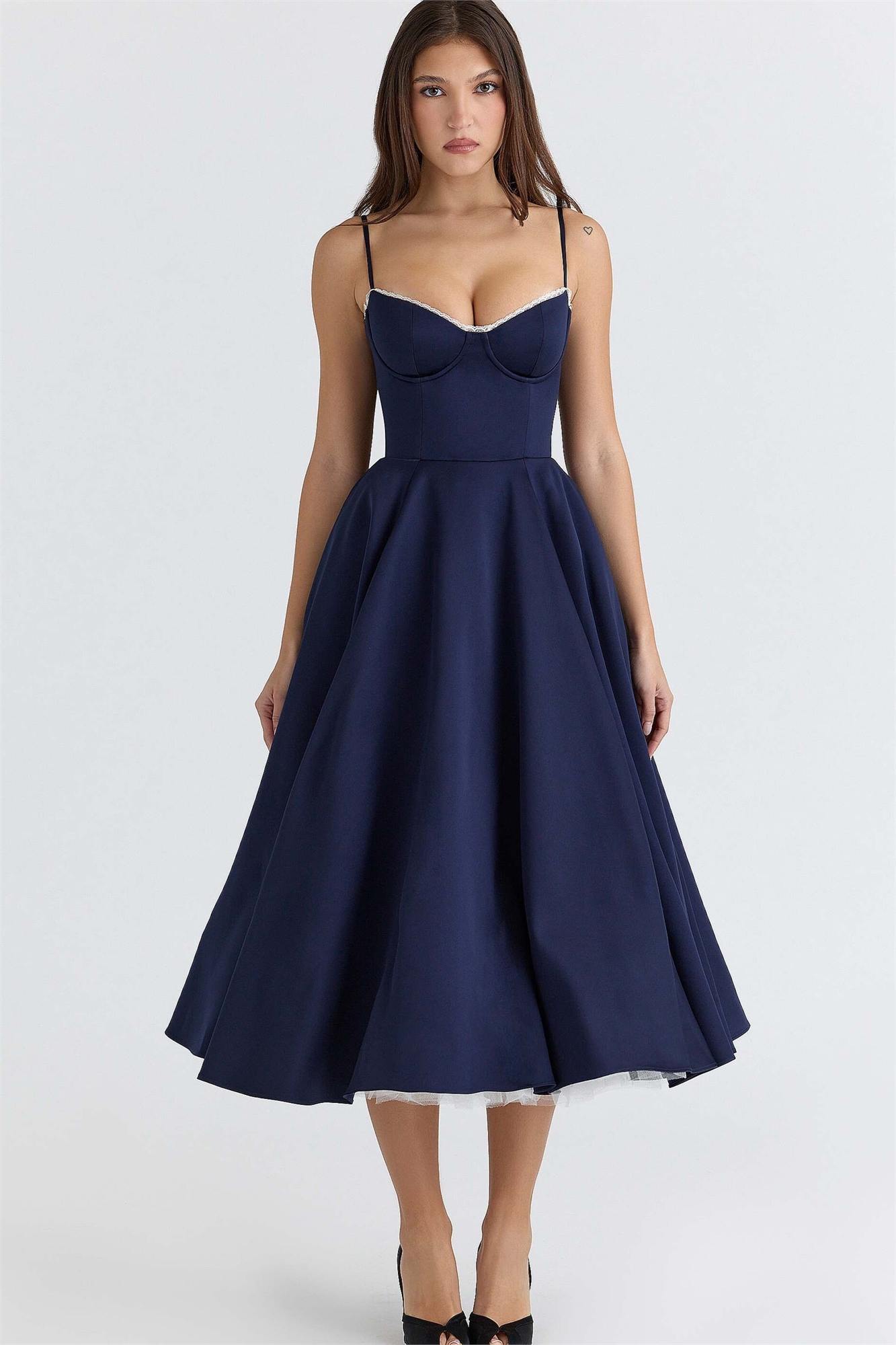 Платье средней длины из атласа и тюля цвета «неви»