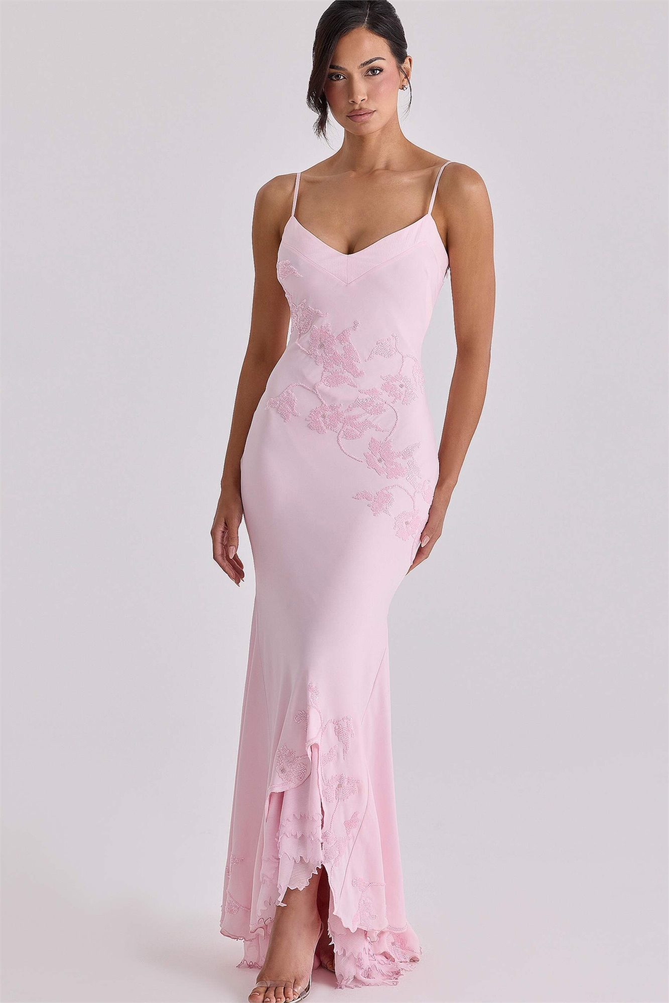 Розовое макси-платье из атласа с ручной вышивкой бисером от Anastelle
