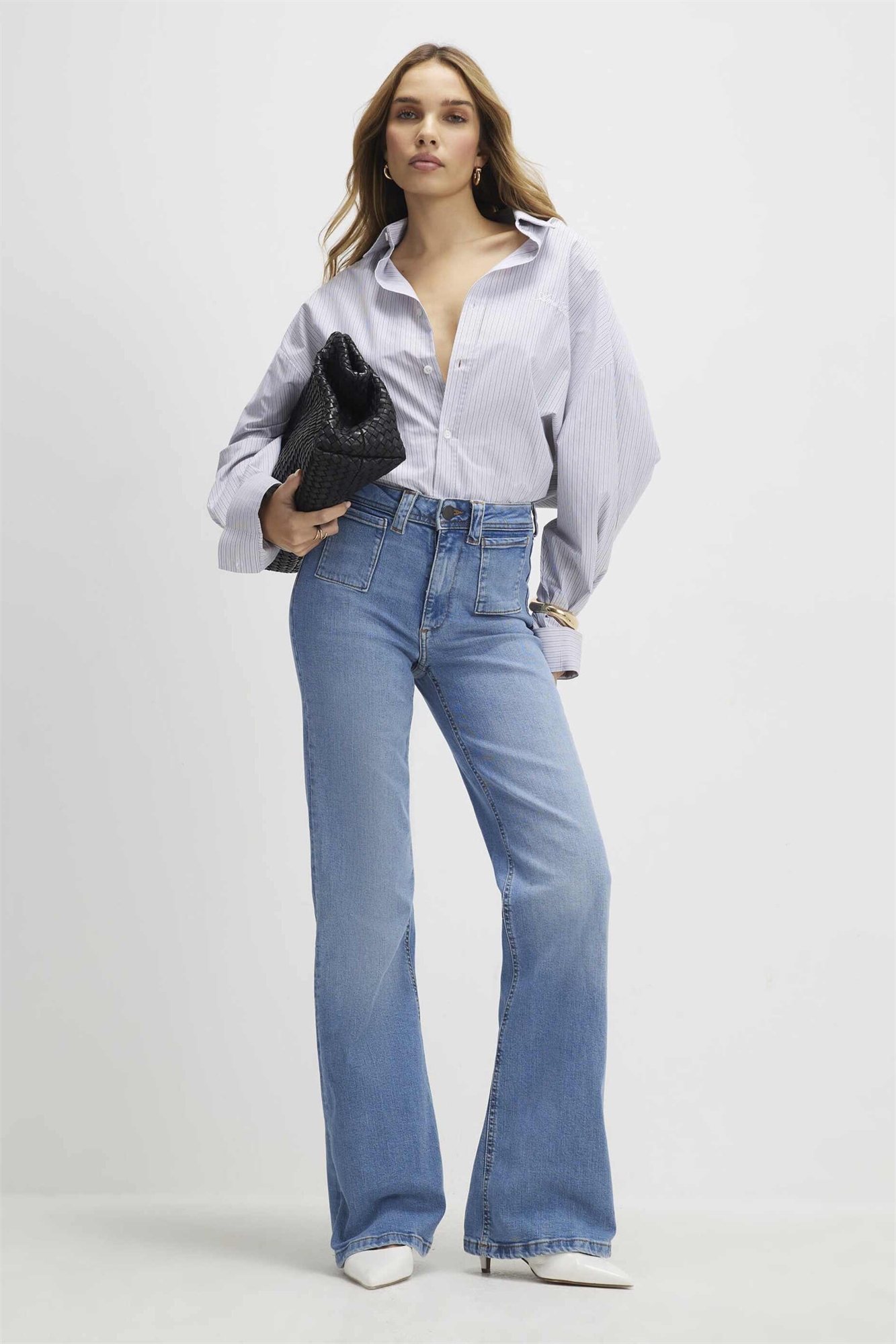 Джинсы с завышенной талией и расклешенным кроем