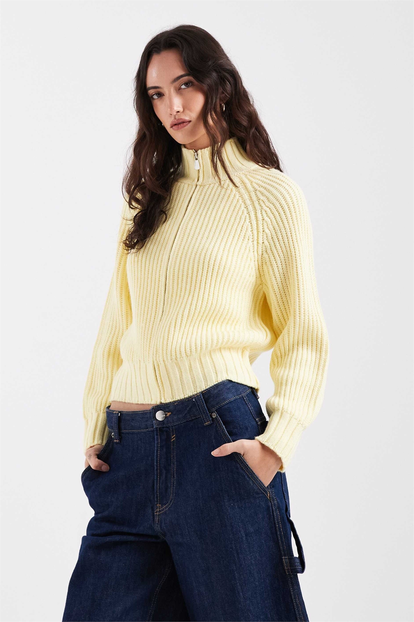 Свитер с воротником-воронкой, связанный из трикотажа, с застежкой-молнией