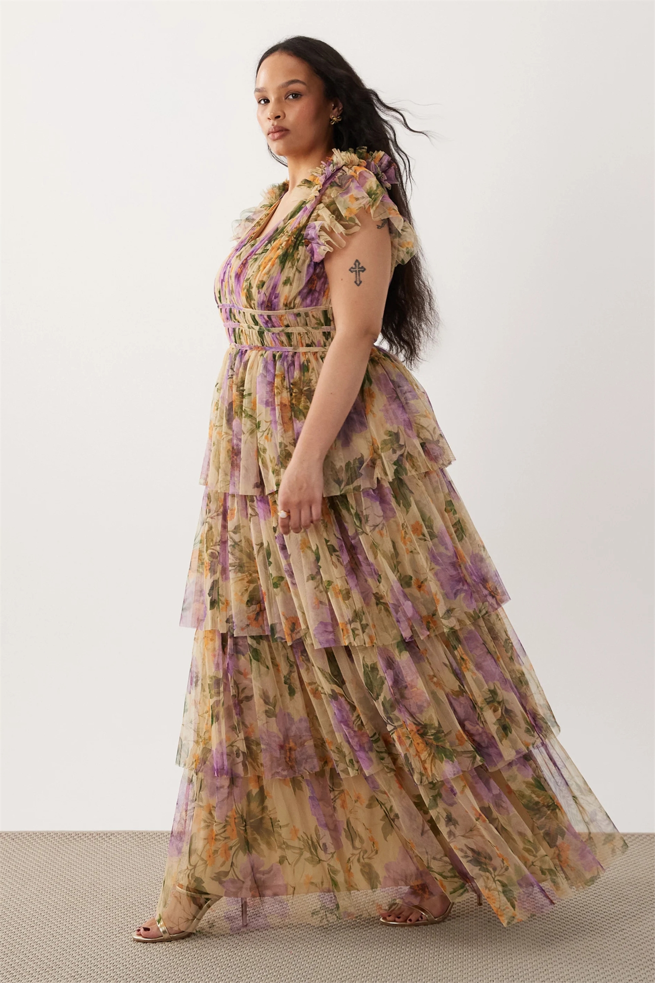 Макси-платье из тюля с воланами на плечах и многослойным кроем