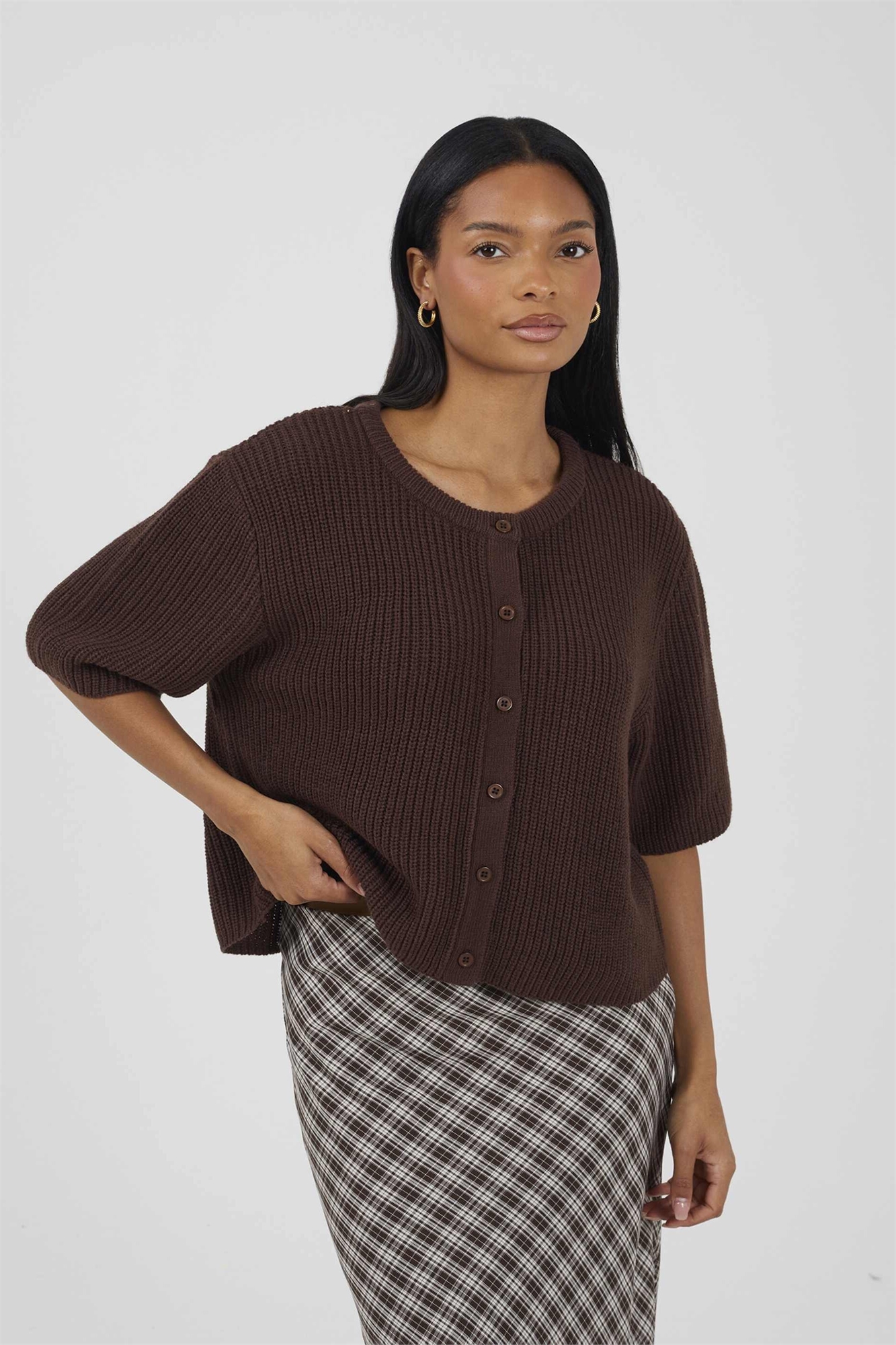Кардиган с коротким рукавом и круглым вырезом из рыбацкой вязки