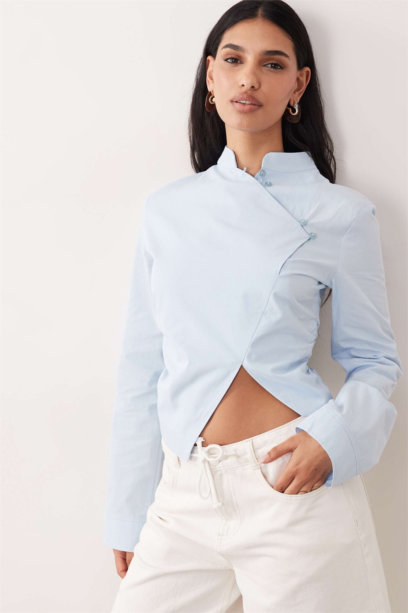 Рубашка с мандариновым воротником и затягивающимся поясом