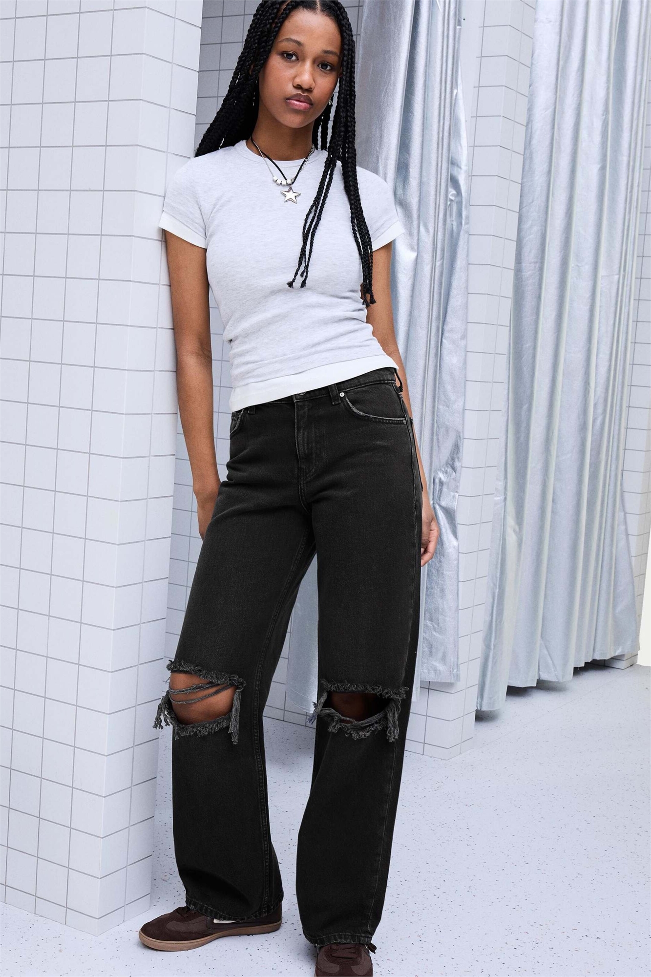 Джинсы с высокой талией, широкими брючинами и потертостями