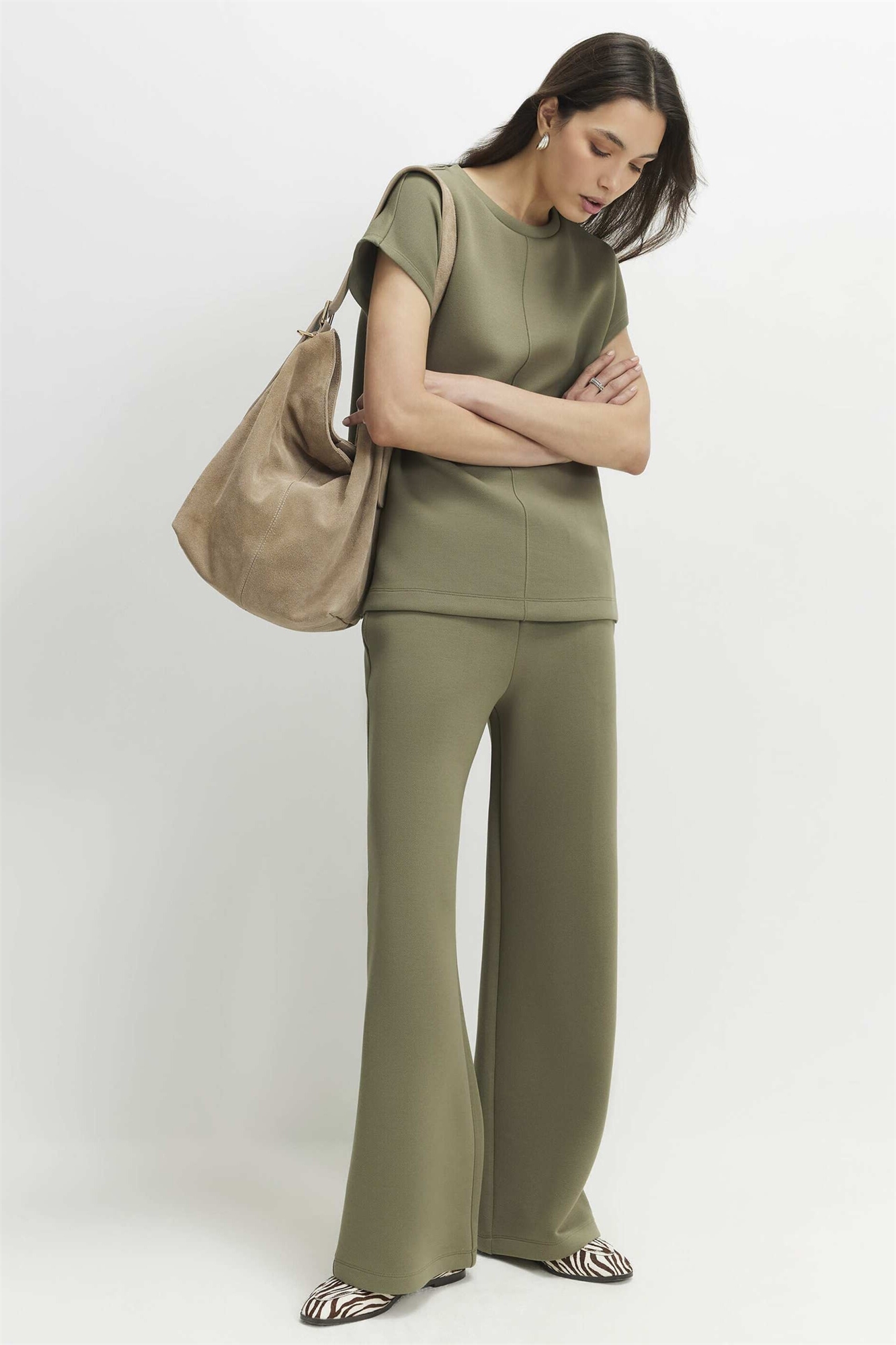 Ткань типа «скаба»: трикотажное полотно, похожее на неопрен, плотное, гладкое и эластичное. Основной состав: 67% полиэстер, 29% вискоза, 4% эластан.