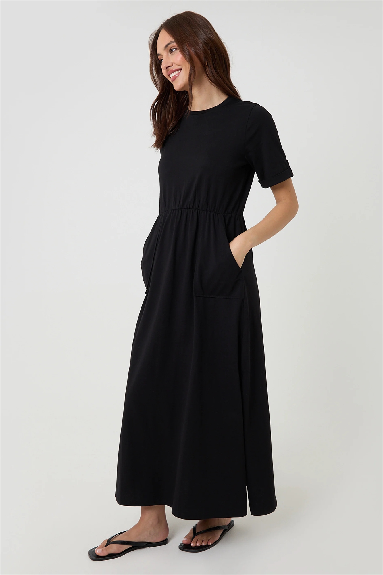 Платье средней длины из джерси с круглым вырезом и накладными карманами