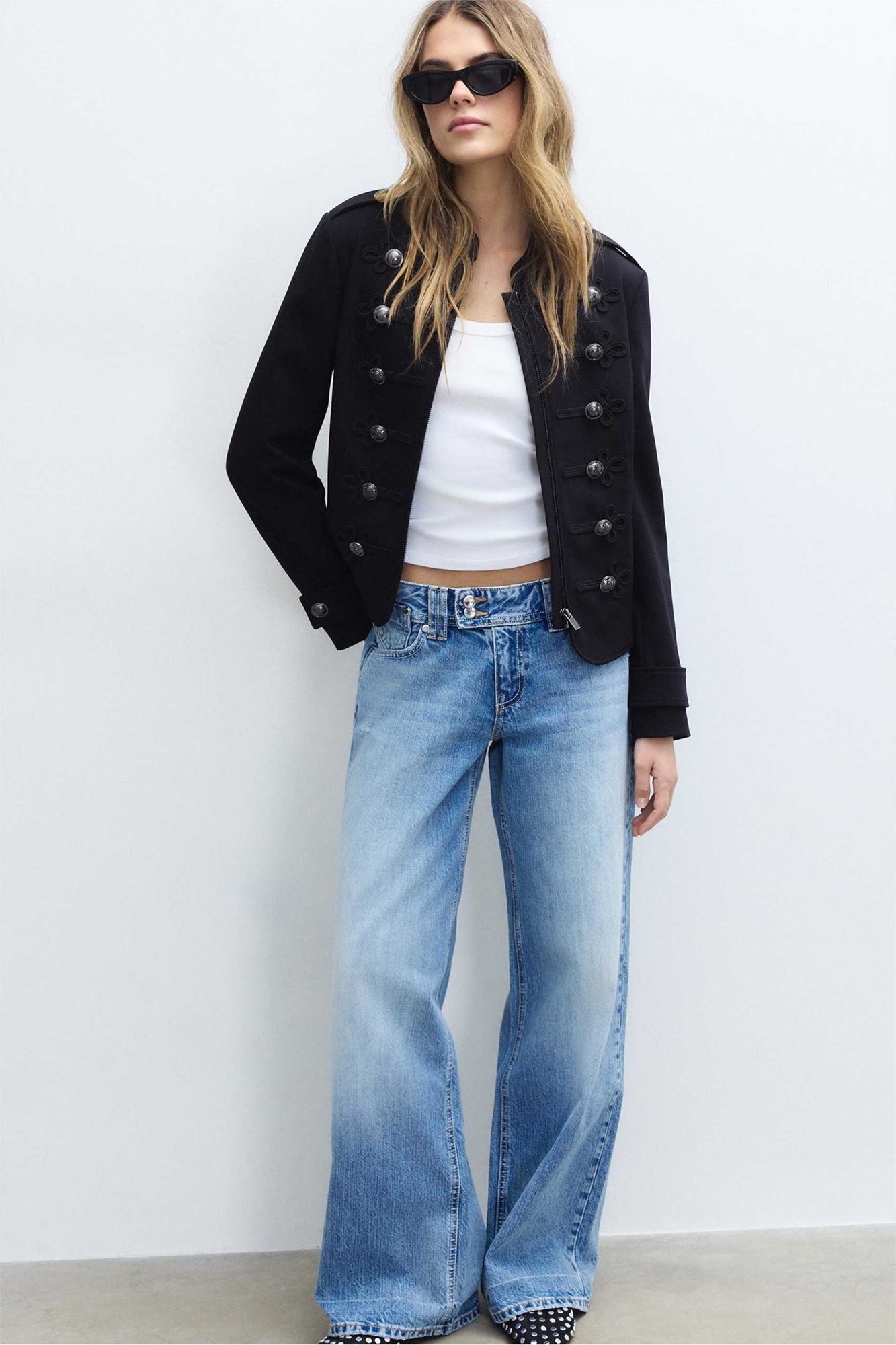 Джинсы с низкой посадкой и широкими брючинами, с пуговицей в виде украшения