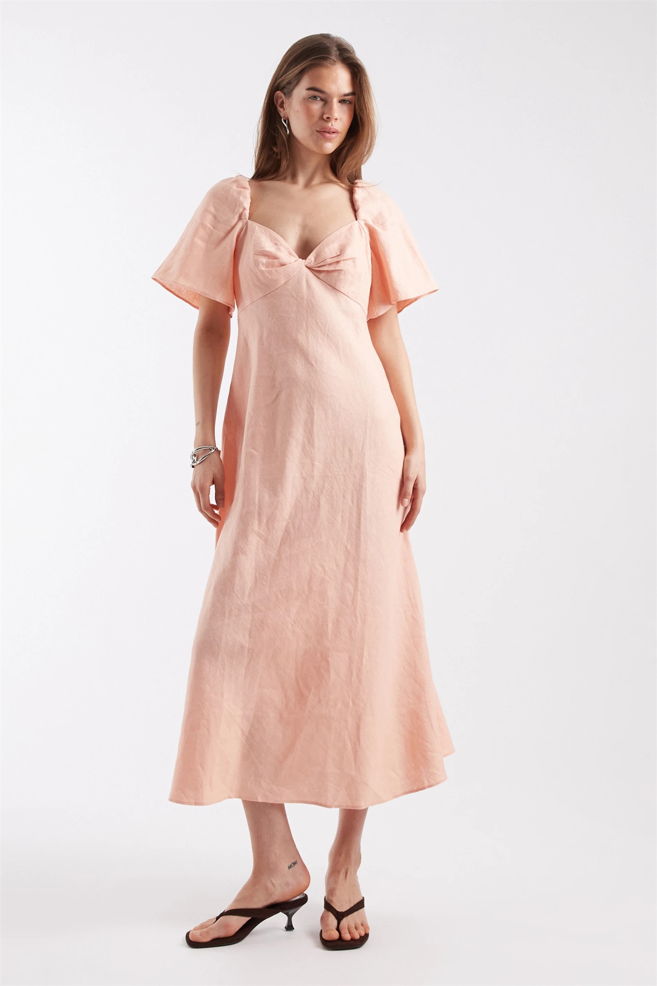 Льняное платье средней длины с буфчатыми рукавами и закрученным вырезом «сердце»