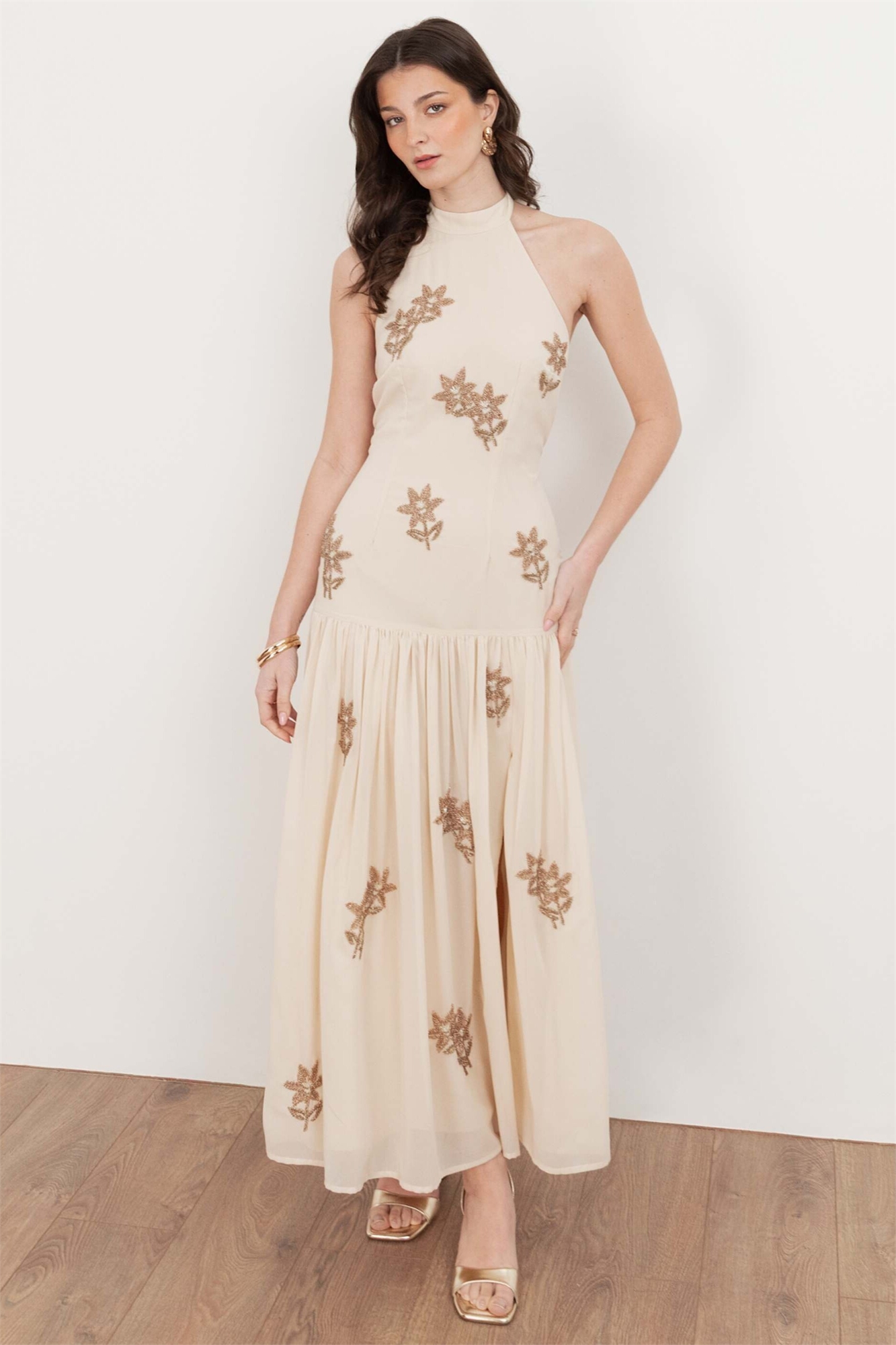 Платье средней длины с заниженной талией, декором и вырезом «холтер»