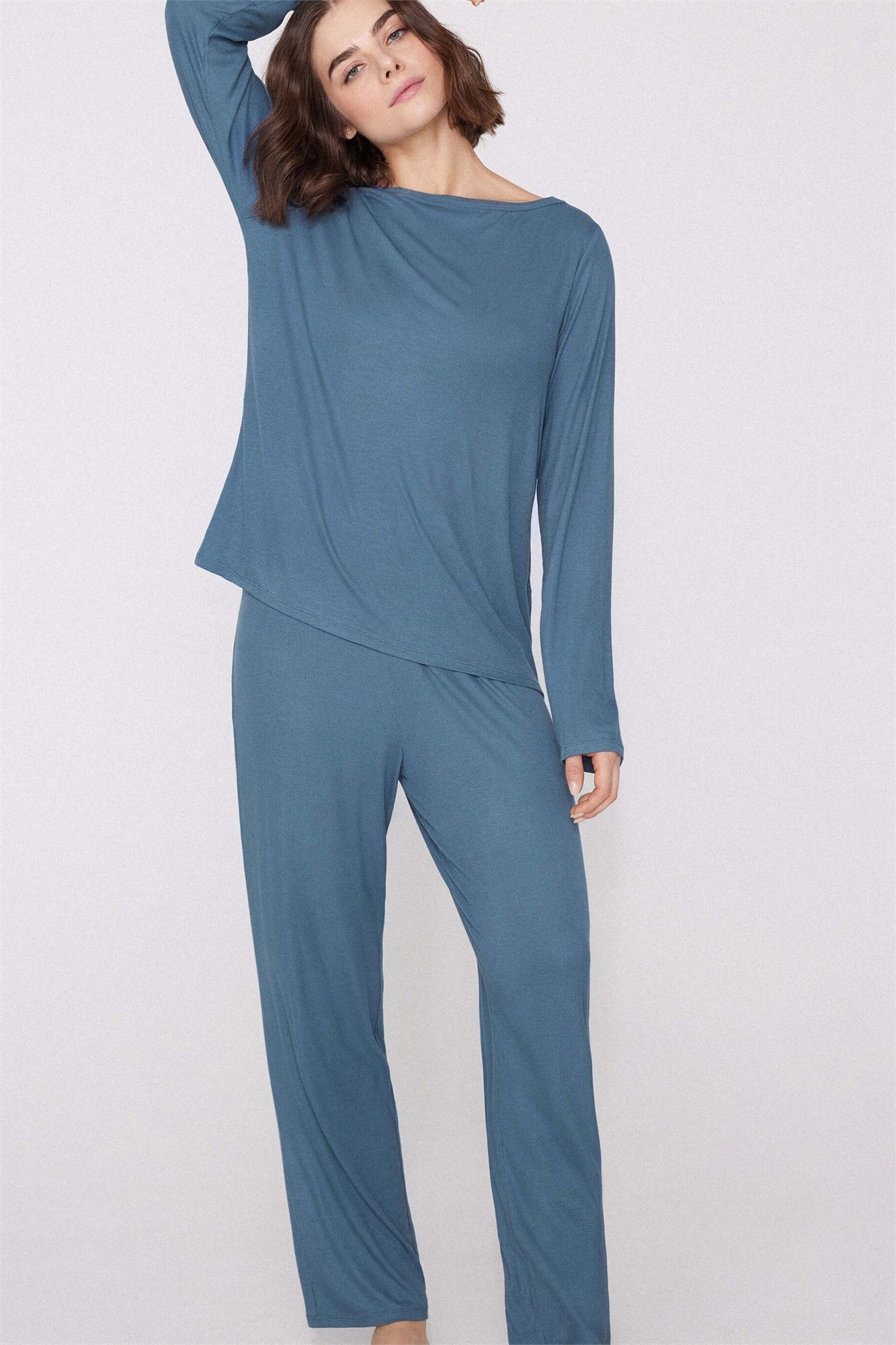 Пижама с длинными рукавами и ребристой отделкой, с вырезом «лодочка»