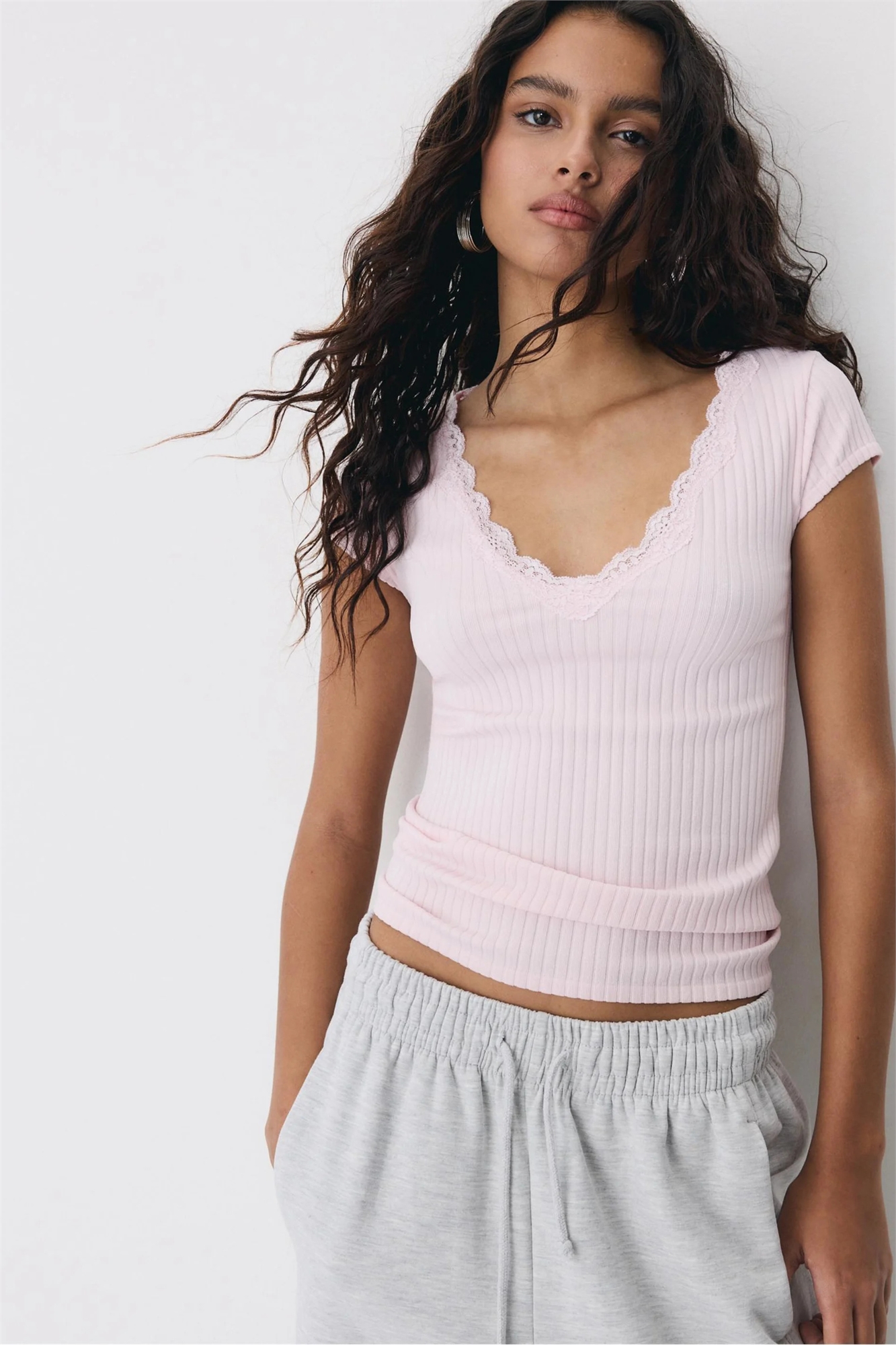 Футболка с V-образным вырезом, кружевом и короткими рукавами