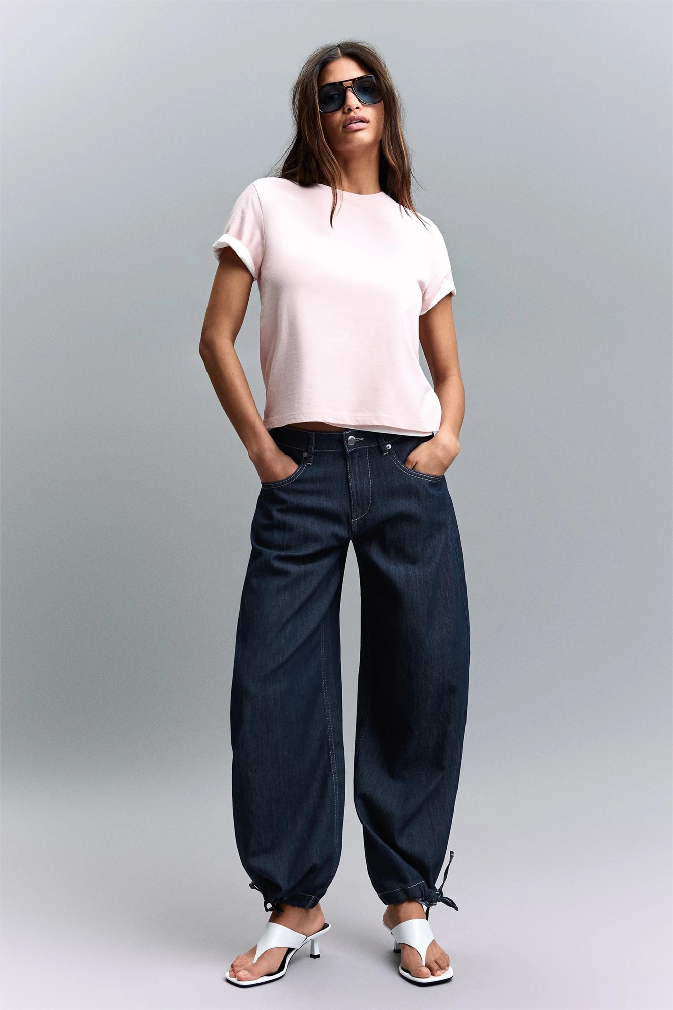 Джинсы-балоны с низкой посадкой и широкими брючинами